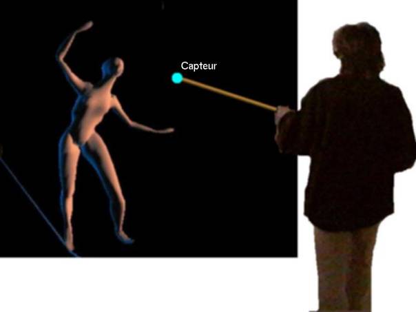 interprétant les positions d´un capteur (polhemus), manipulé par le spectateur,