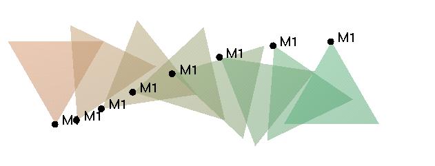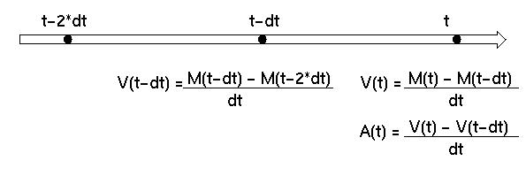 trois poistions clées non alignées, à l´instant t2-e/2 la vitesse V1 est